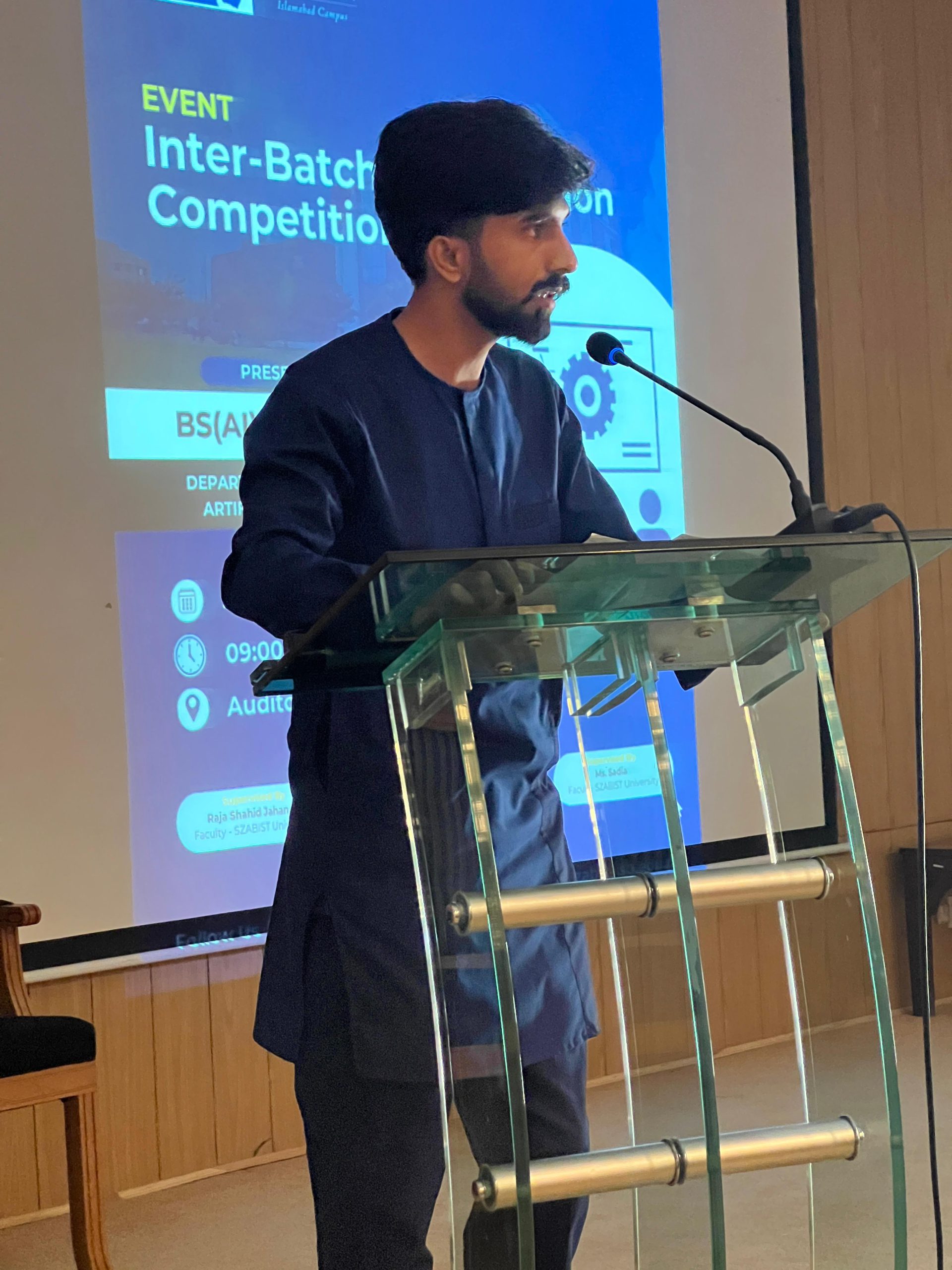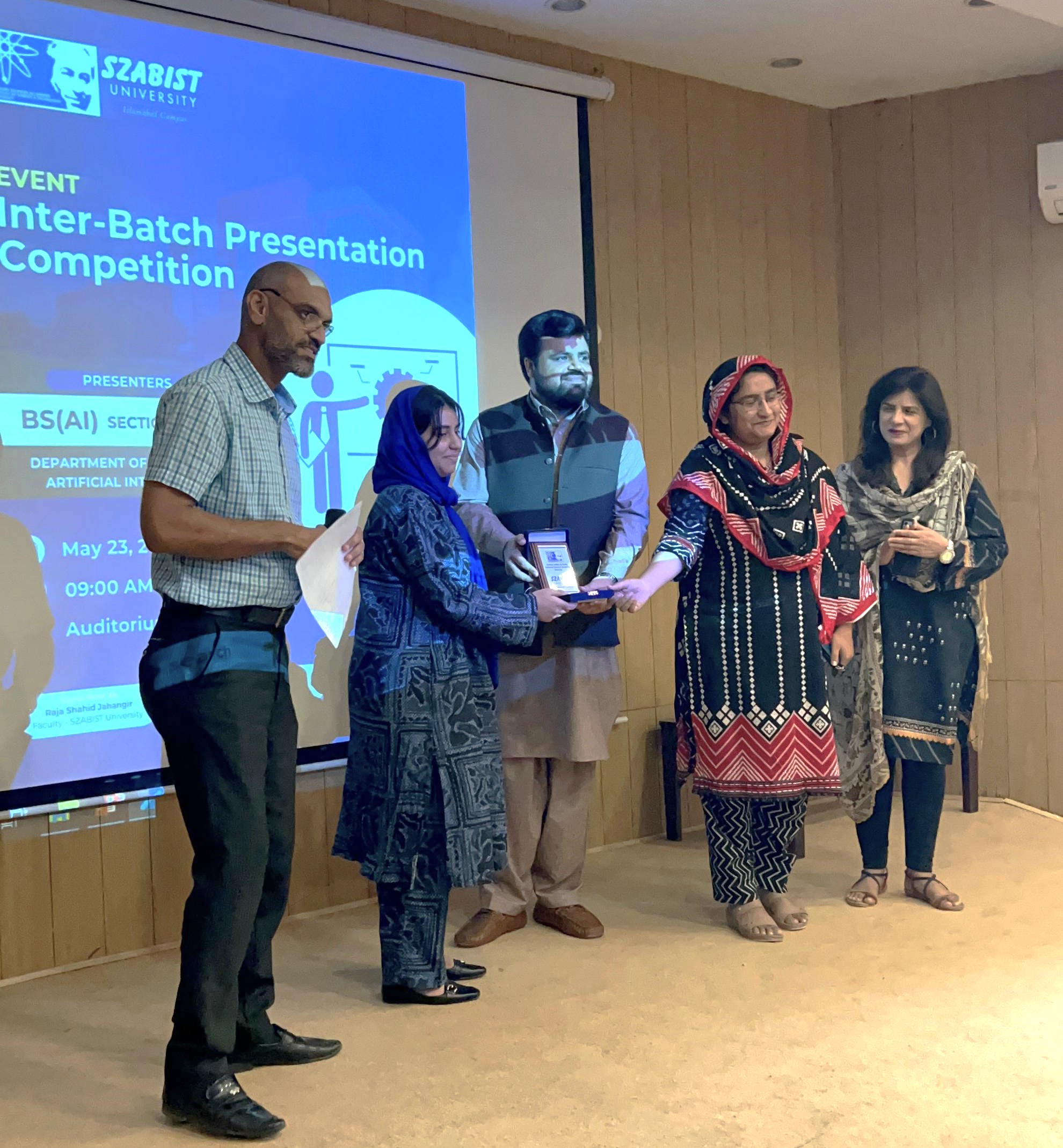 We are thrilled to share that the Inter-Batch Presentation Competition for BS(AI) sections A, B, and C was a remarkable success! Held on May 23, 2024, at the SZABIST University Islamabad Campus, the event showcased the exceptional talents of our students in the Department of Robotics & Artificial Intelligence but with respect to presentation skills. The presentations were insightful,innovative, and demonstrated the students’ deep understanding of the Presentation Skills taught by their instructors.