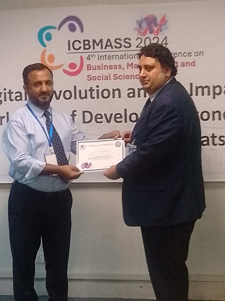 Mr. Khalid Abdul Ghafoor the faculty of Management Sciences SZABIST University Islamabad presented the research article titled “The Triad of Investment Orientation, Well-Being and Parents’ Financial Behavior: Insights from Emerging Adults” in the 4th International Conference on Business, Management and Social Sciences (ICBMASS) at NUST on April 22,2024 – 23, 2024.
