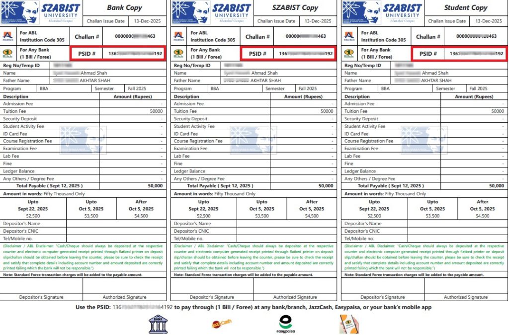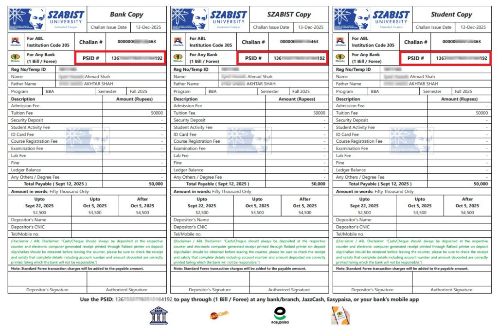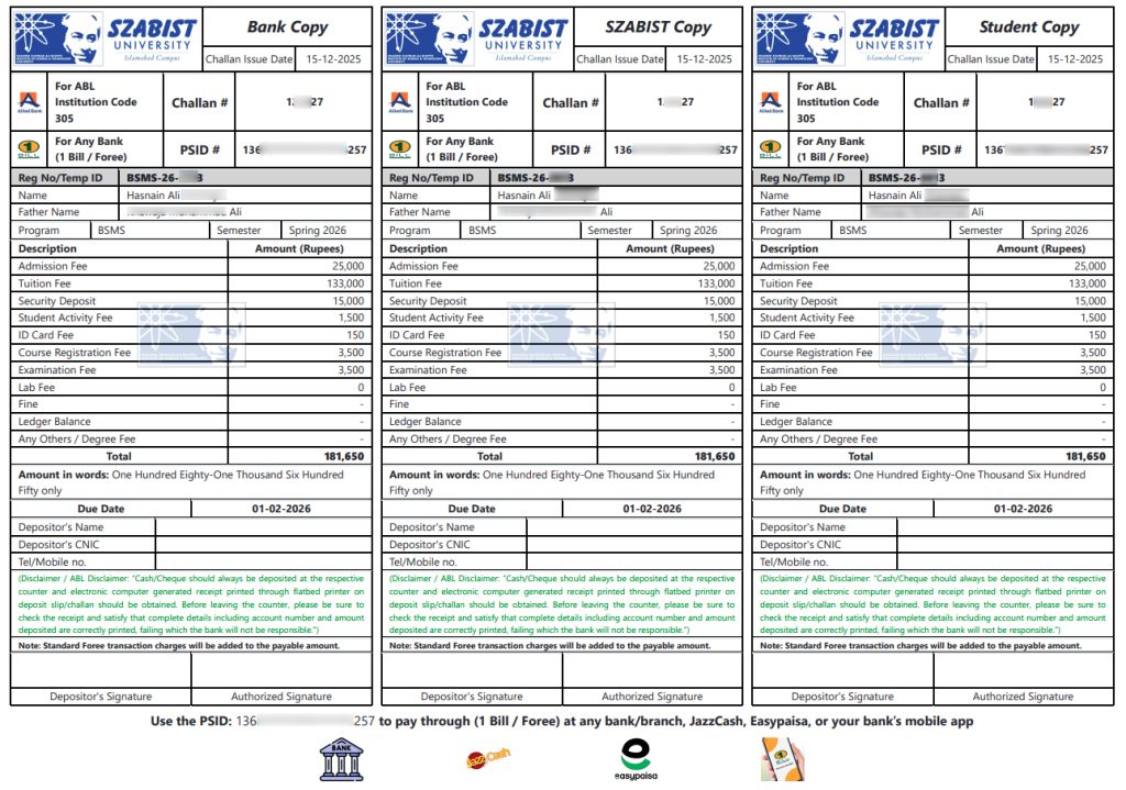 Upon successful selection, students are issued an Offer Letter along with a System-Generated Fee Challan. The following payment options are available