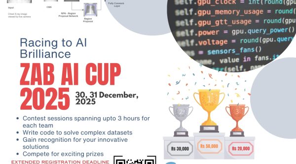 The Department of Robotics and Artificial Intelligence at SZABIST University Islamabad is excited to announce the 3rd ZAB AI CUP 2025, now scheduled for December 30–31, 2025. This competition invites BS, MS, and PhD students from computing and related fields to showcase their skills in Machine Learning and Deep Learning, where teams of two will develop models to achieve high accuracy on provided datasets. The early bird registration fee is...Read More